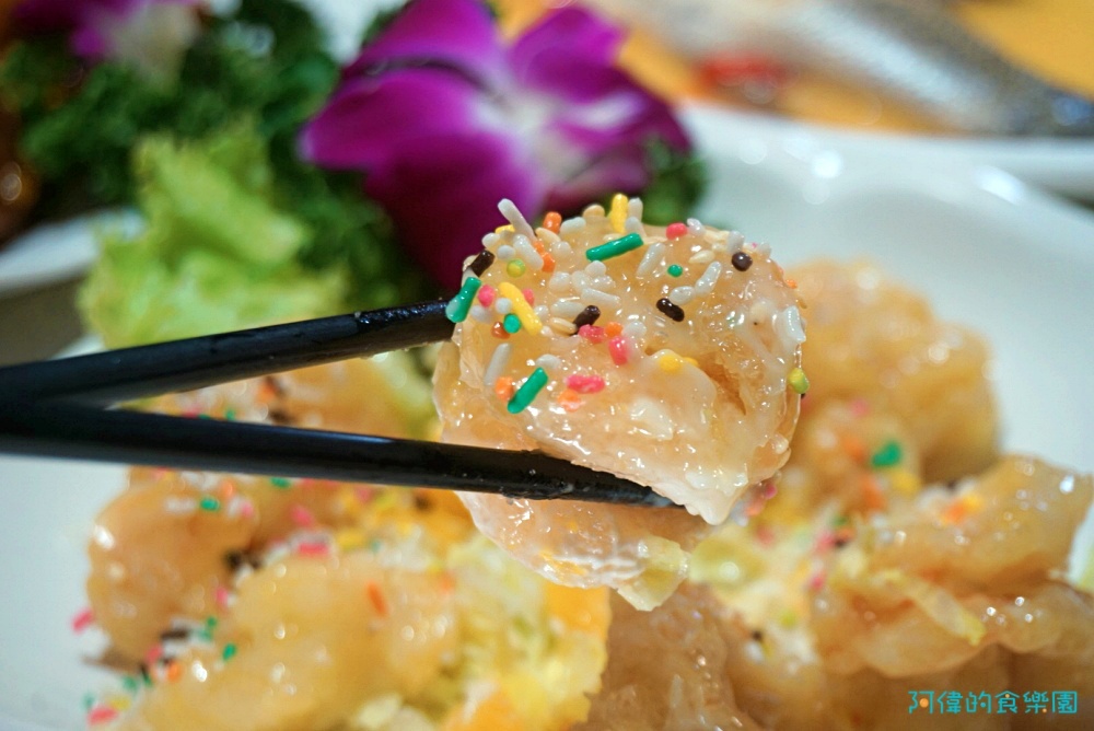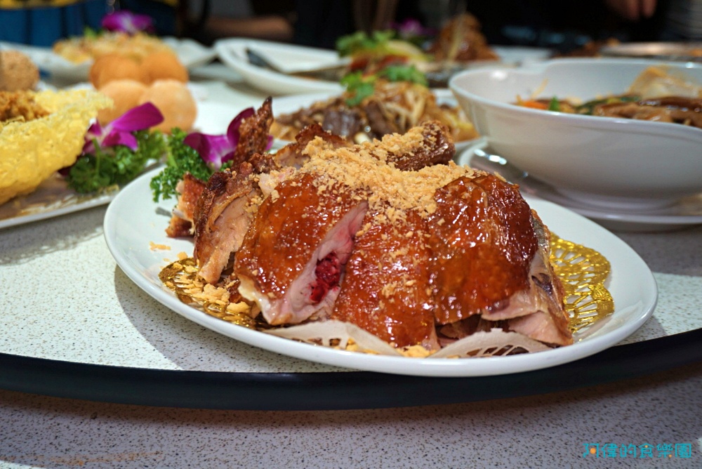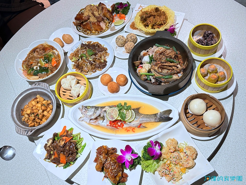 這天我們點了滿桌的餐點,有脆皮雞、泰式檸檬鱸魚、橙汁子排…等,還有魚子蒸燒賣、鹹水餃、爆漿芝麻球…等港點,看得我饑腸轆轆,口水直流啊!