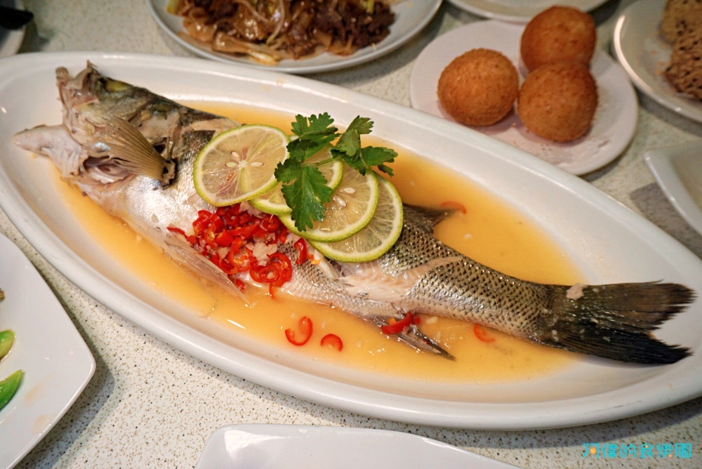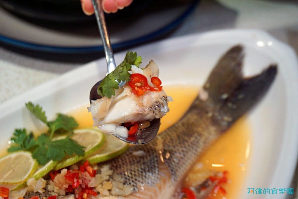新鮮看得見的泰式檸檬鱸魚,酸甜適中的湯汁、檸檬片、香菜、紅辣椒點綴,讓它的色香味一應俱全。