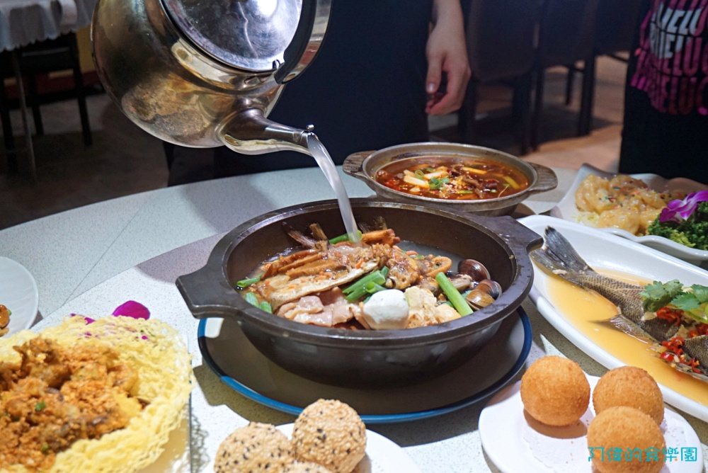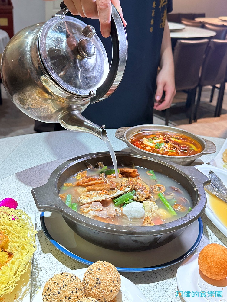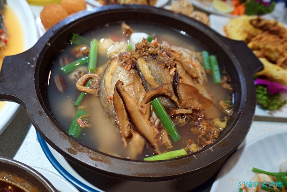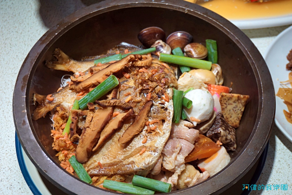 這是一道傳統台菜,沒想到在這也能吃到。裡面的食材好多、好豐富,鯧魚看起來有三條,還有豬肉片、蛤仔、芋頭等等。