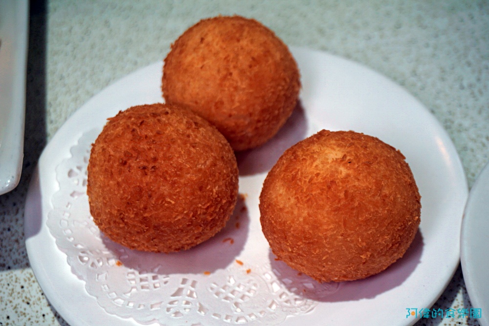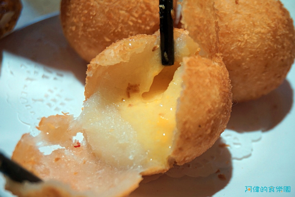 一開始看到這三顆球,不知裡面包什麼?外皮裹著麵包粉炸的香酥,看起來就很誘人。