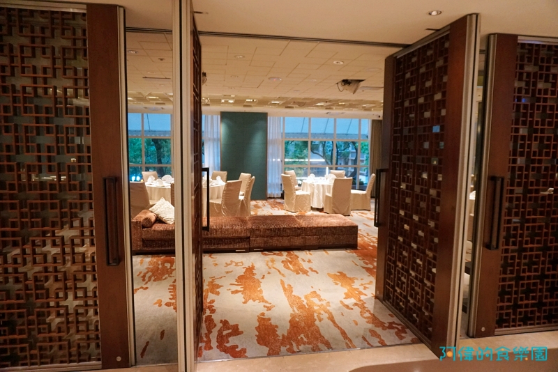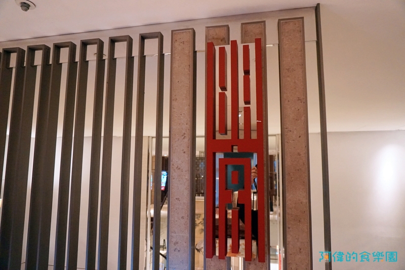 明宮粵菜廳的入口,大門使用東方窗櫺格元素,立刻沉浸式進入中式料理的情境裡。