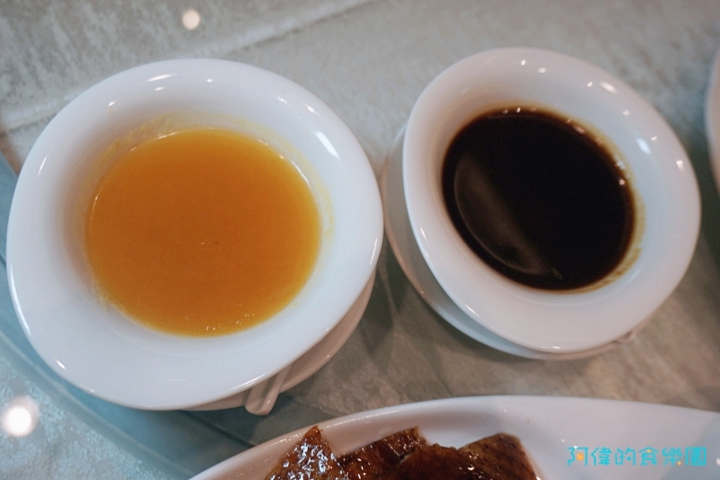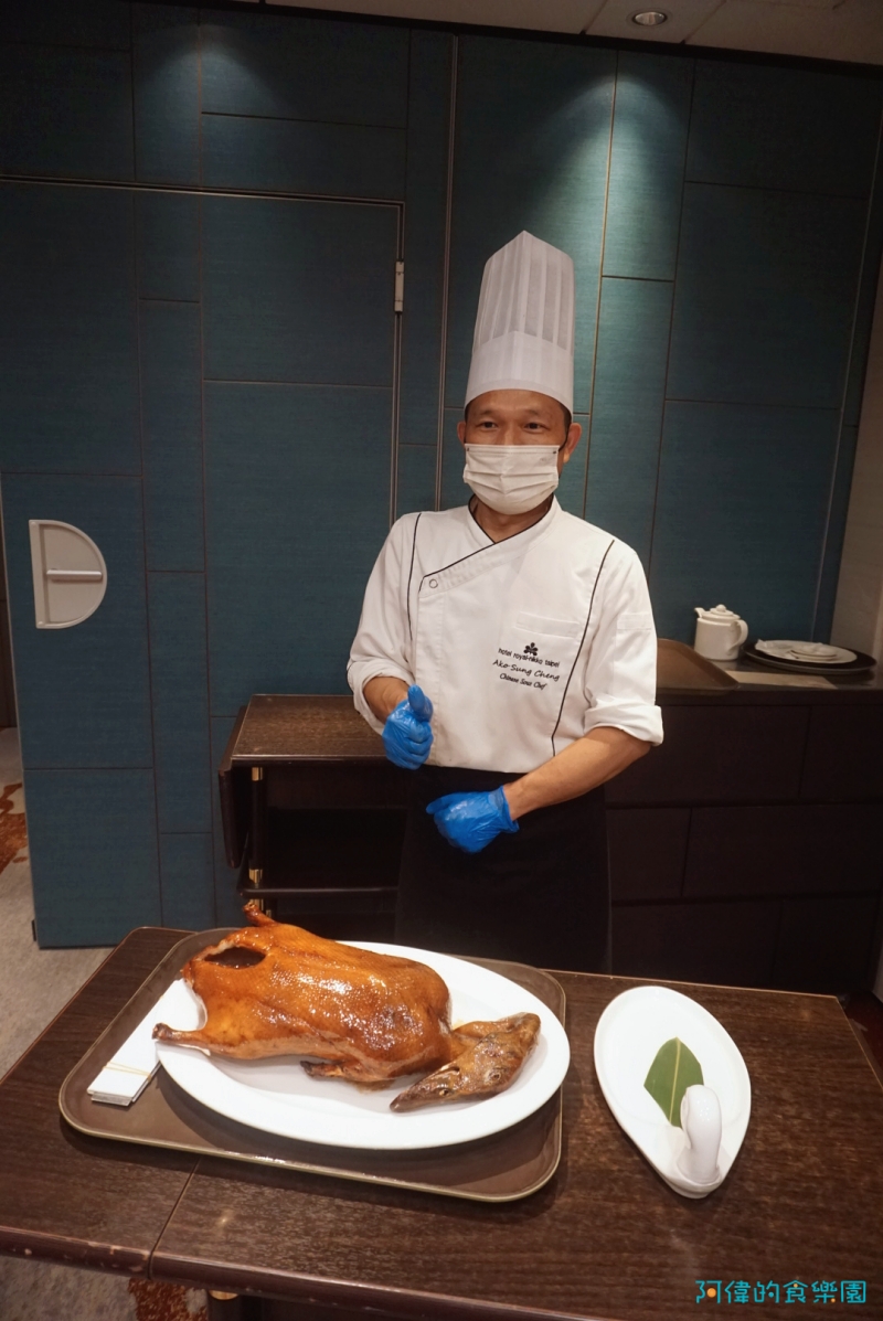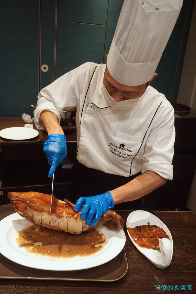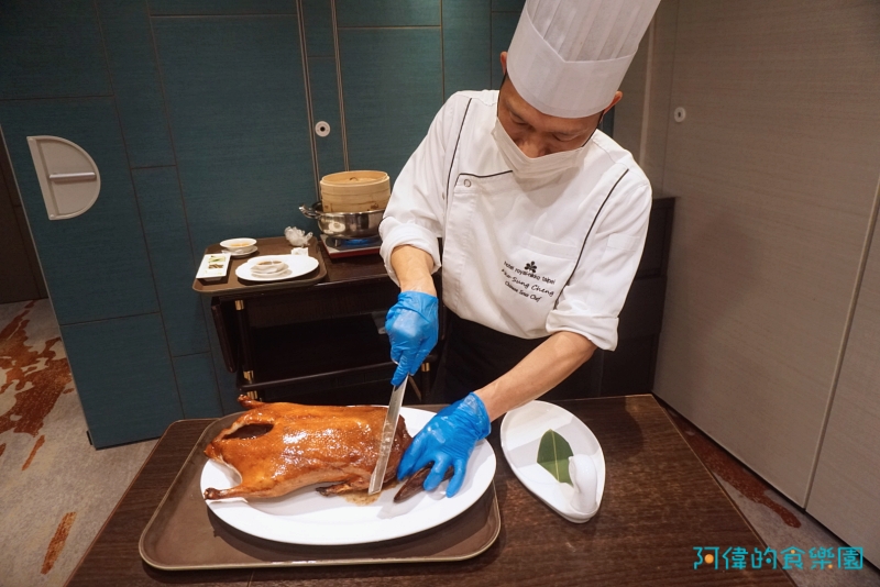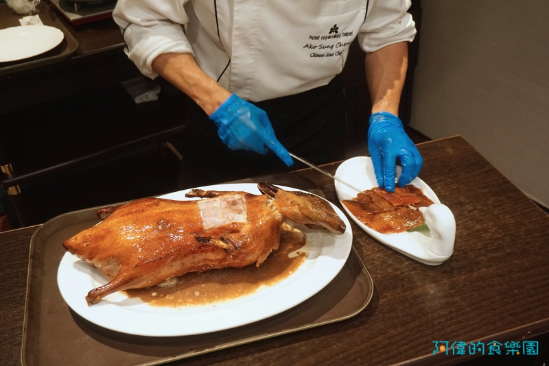 主廚以很俐落的刀工片鴨,每一片都四四方方的很整齊,而且還會將皮下油脂割除。