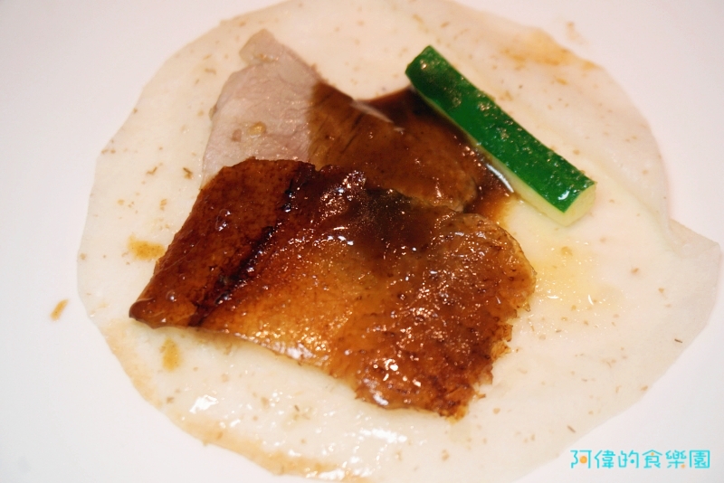 我第一片先只包著一條小黃瓜,加了雙醬,帶有鳳梨醬的甜與甜麵醬的鹹香,整個味蕾好豐富,鴨肉與鴨皮軟嫩脆融合,好吃到爆。