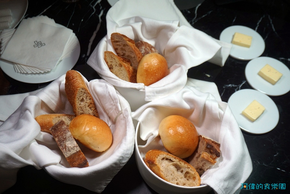 精選麵包盤有四塊麵包,附上奶油(奶油上有撒一些海鹽),吃來更為提味。