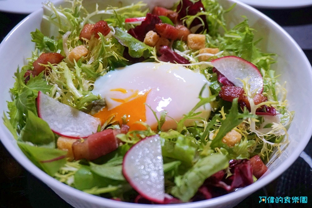 有一顆溫泉蛋的里昂沙拉,吃之前要將它弄破攪拌均勻。