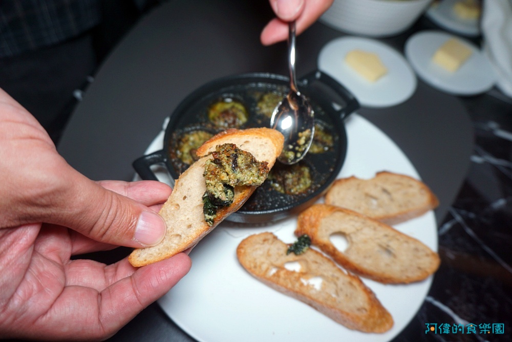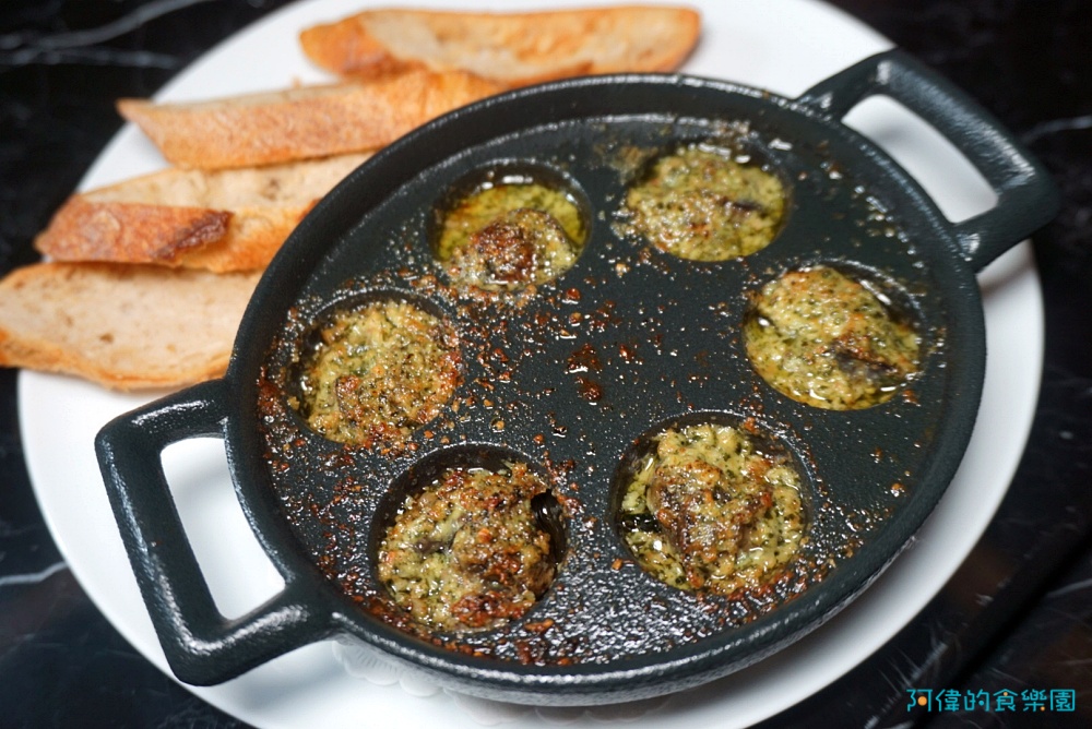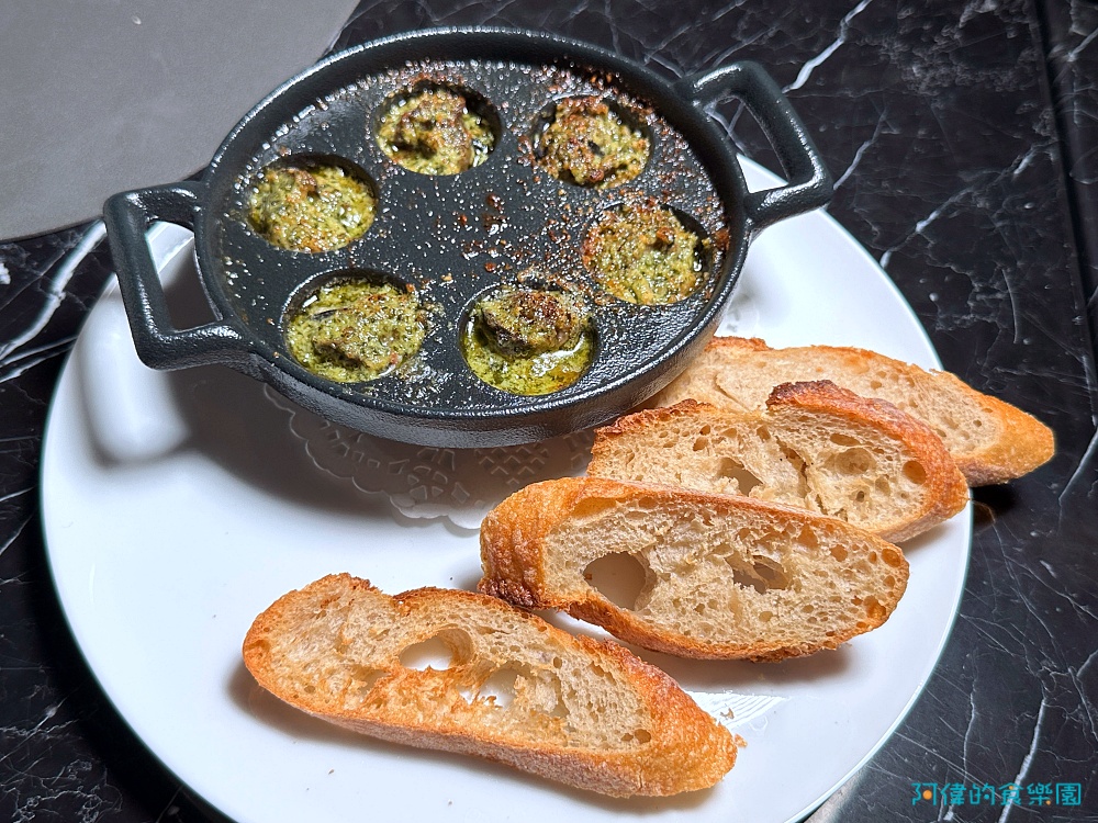 這裡選用的是來自法國東部布根地灰蝸牛,肉質細緻柔軟、香氣純淨、風味溫潤。再以蒜香、歐芹、發酵奶油調成的醬烘烤過,一上桌就香氣四溢。