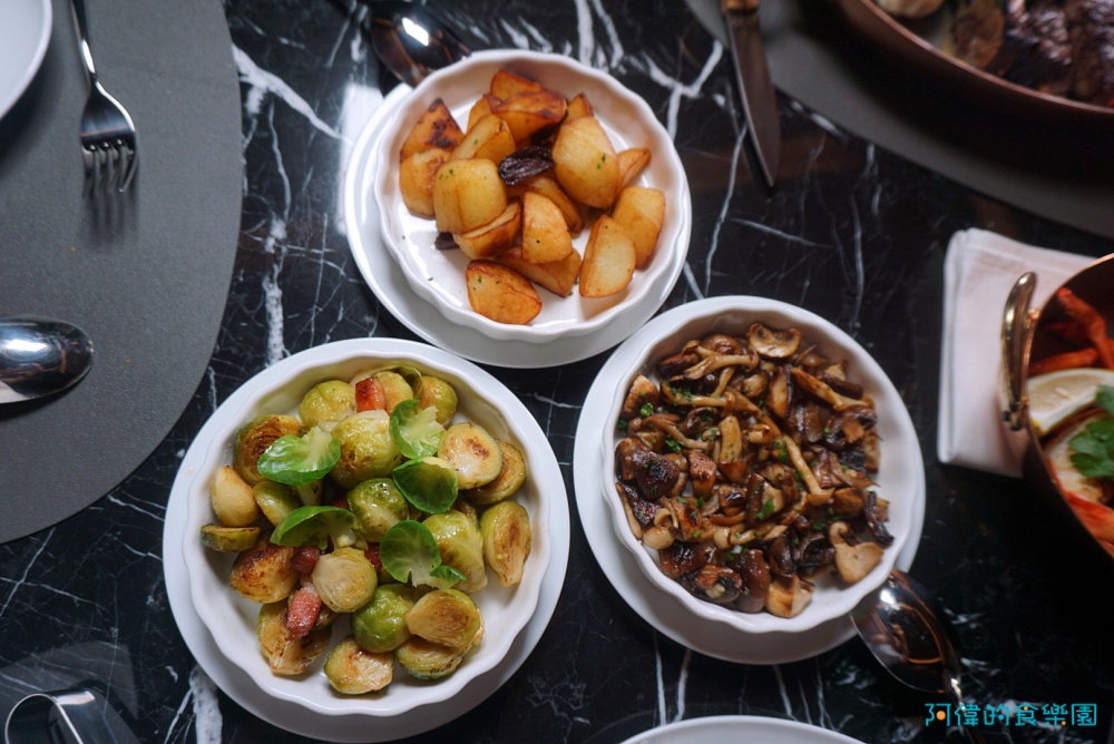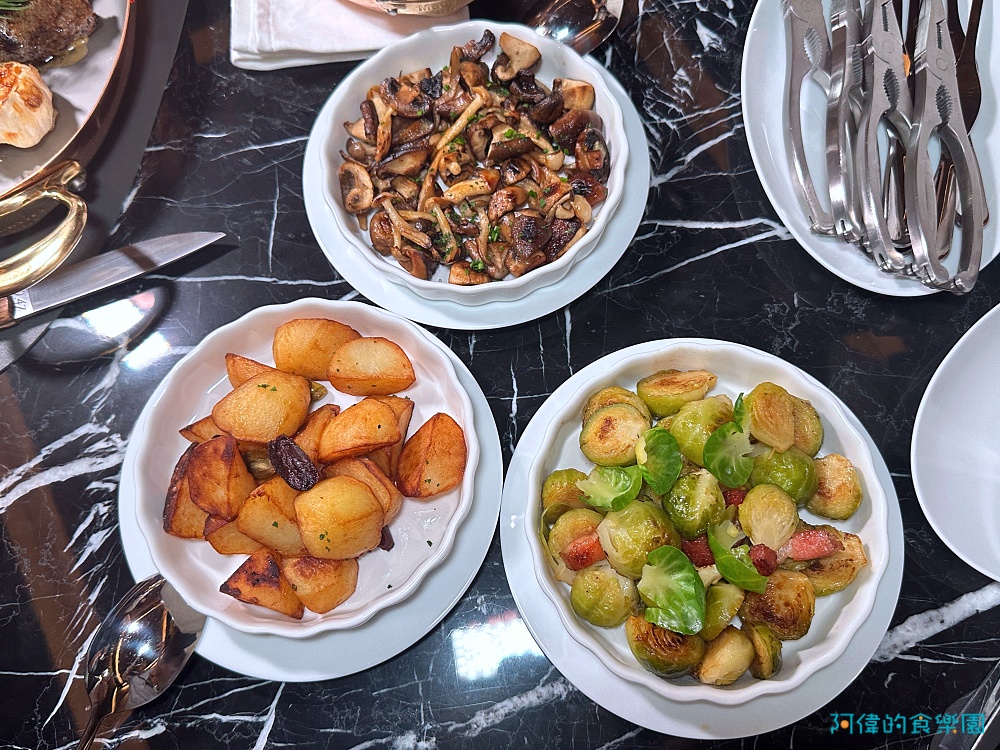 接下來是牛排登場前,先上的三份配菜:培根孢子甘藍、橄欖炒小洋芋、綜合炒蘑菇