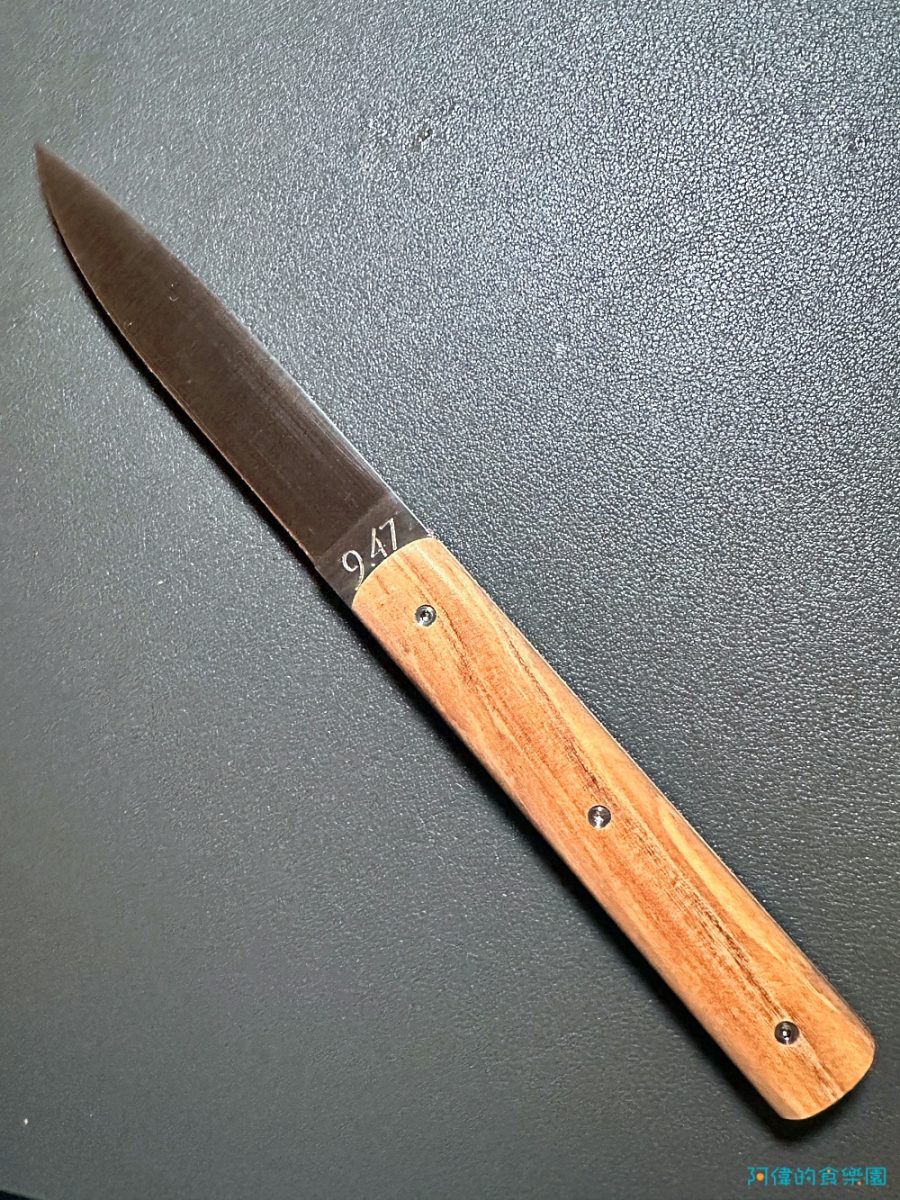選用的牛排刀上有9.47數字,出自一家台灣的餐具品牌,「9.47」這個名稱來自刀刃角度設定(約 9.47°),象徵精準銳利的切割角度,握柄多為天然胡桃木、橡木,手感溫潤,長時間握也不疲勞。