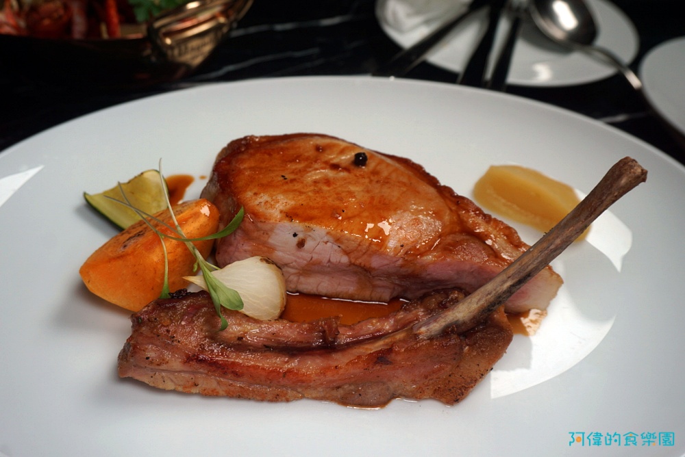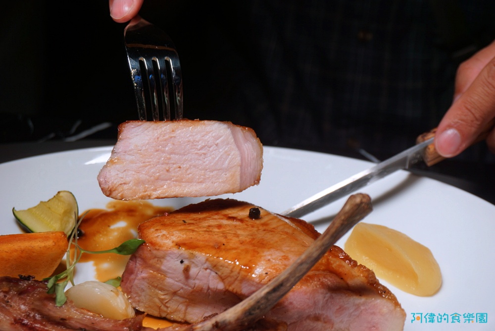 這是一道出乎我意料美味的排餐,選用以巧克力餵養的台灣葛瑪蘭豬,肉質呈現淡粉紅色,口感細嫩多汁,由於豬隻吃巧克力長大,所以肉中真的有淡淡的巧克力香。旁邊搭配蘋果泥、櫛瓜、珍珠洋蔥,搭配著吃可解膩。