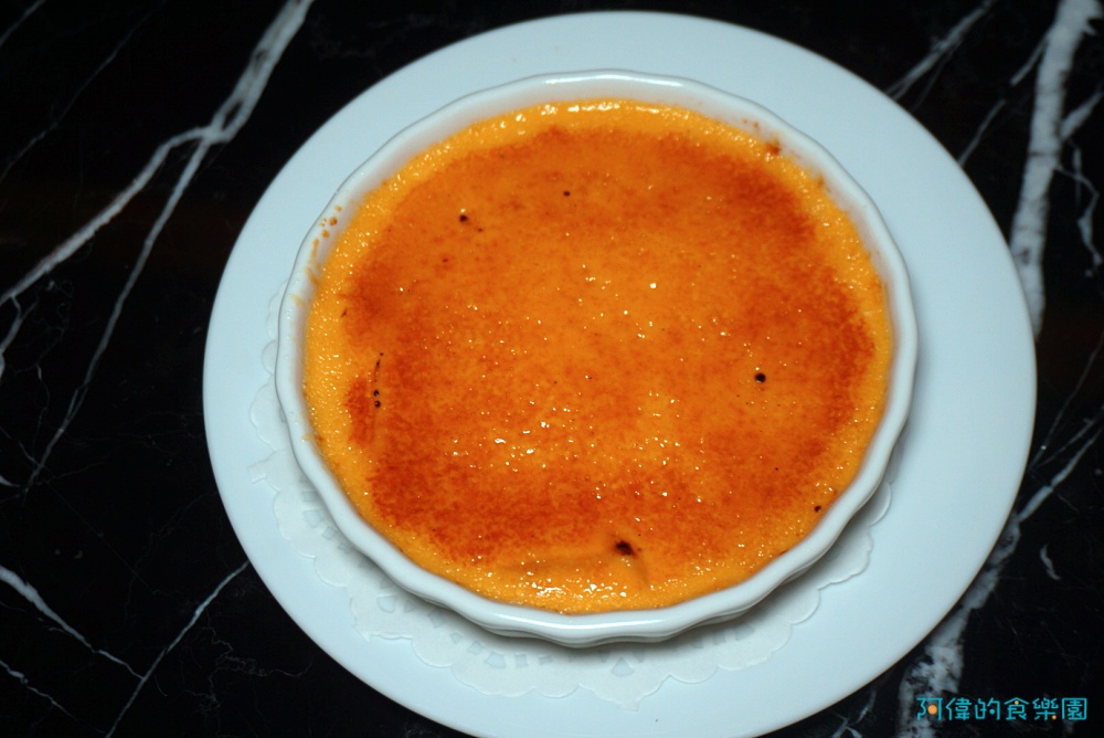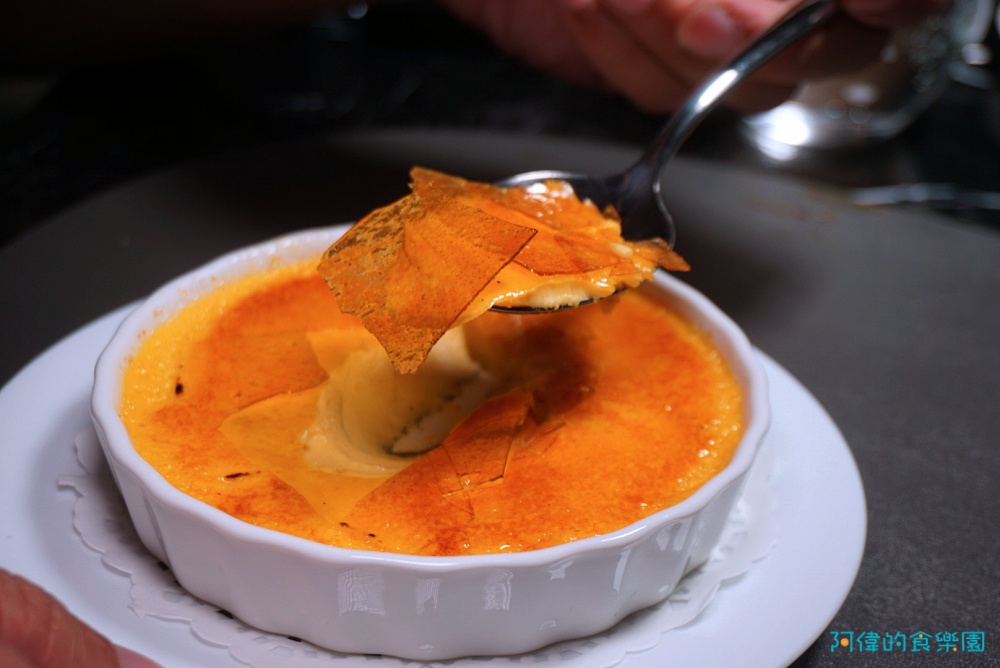 來到甜點環節,這份烤布蕾使用真材實料的馬達加斯加香草,表層將糖炙燒成脆片,金黃色澤相當漂亮。