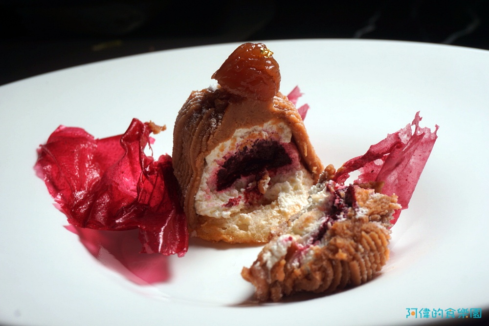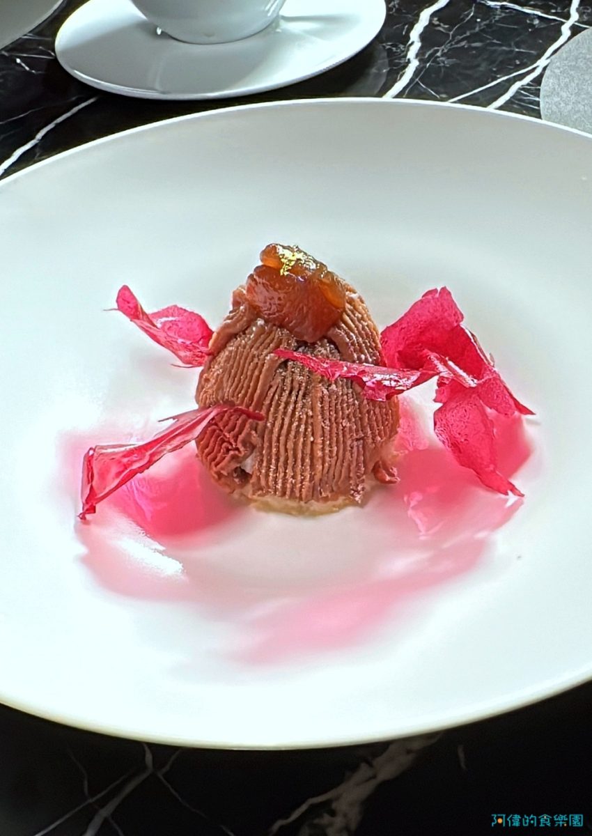 四周圍紅色的裙襬也是用黑醋栗做的,造型充滿法視優雅與浪漫,將它放進口中瞬間融化。
