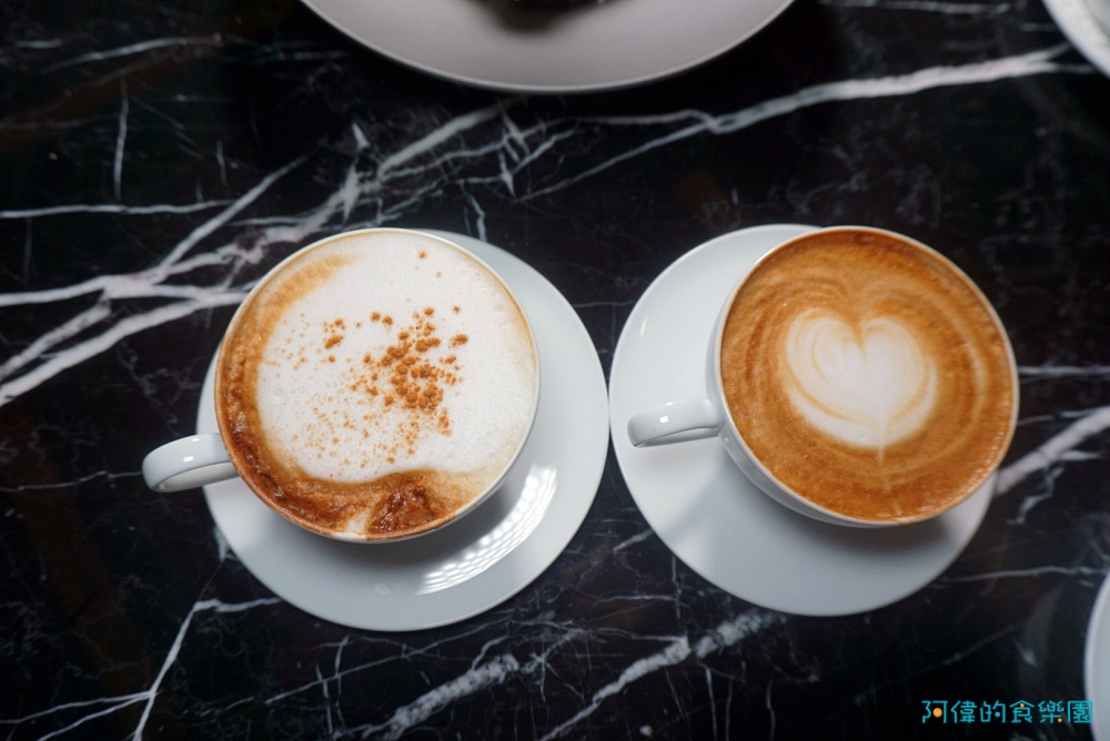 附餐的咖啡,左邊是我點的卡布奇諾,上面有撒肉桂粉,奶泡綿密、咖啡香醇。