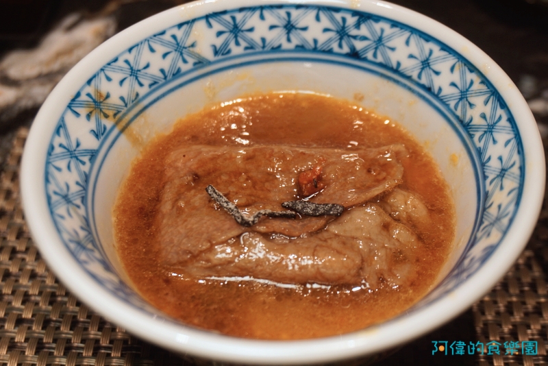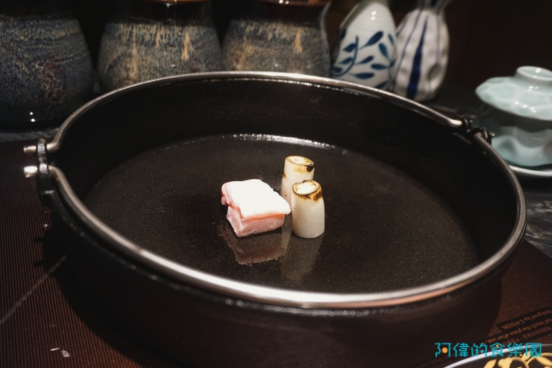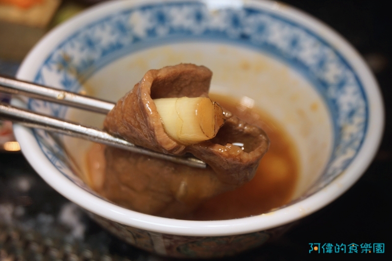 師傅將一開始在鍋裡加熱的蔥段包進肉片裡,帶有纖維與水份稍微解了和牛的油膩感,又是不同的新奇口感。