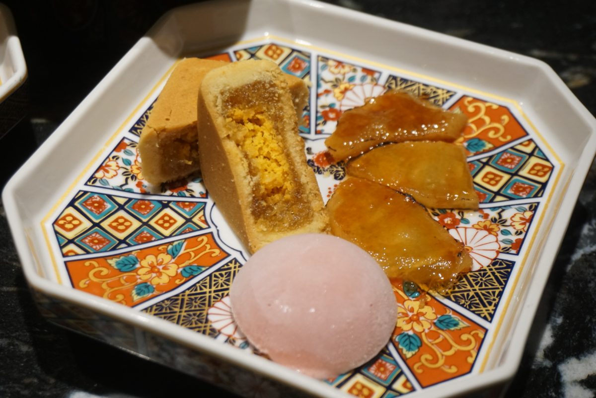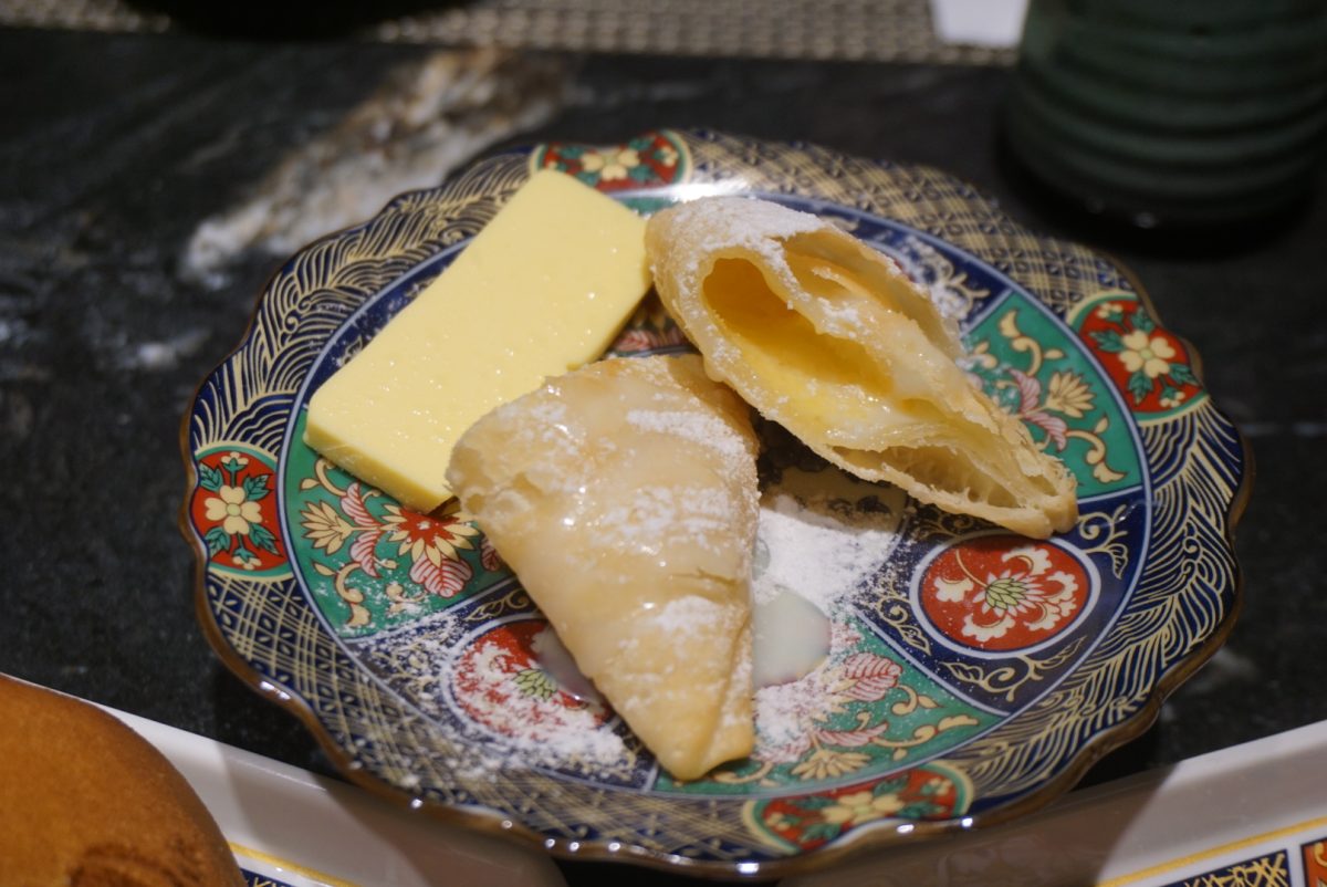 這應該是我吃過最好吃的鳳凰酥了!因為它剛剛烤出來,拿在手中還是溫熱的,吃進口中餅皮極酥而且不膩,裡面的鳳梨餡與鹹蛋黃又搭配得很好,兩者的香氣都很足。一旁還有鳳梨果乾(表面有焦糖脆片)以及酸甜水果味的雪酪冰淇淋。