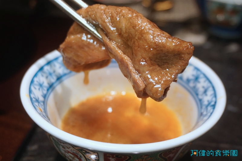 捲起之後放進蛋液裡,包裹著滑嫩蛋汁的五分熟和牛,底下那一面有著焦糖的甜脆,也有醬油的鹹香與蛋香,加上入口即化的肉質與牛油甜香,吃在口中的幸福感直接爆棚,我沒有吃過這麼好吃的和牛壽喜燒!